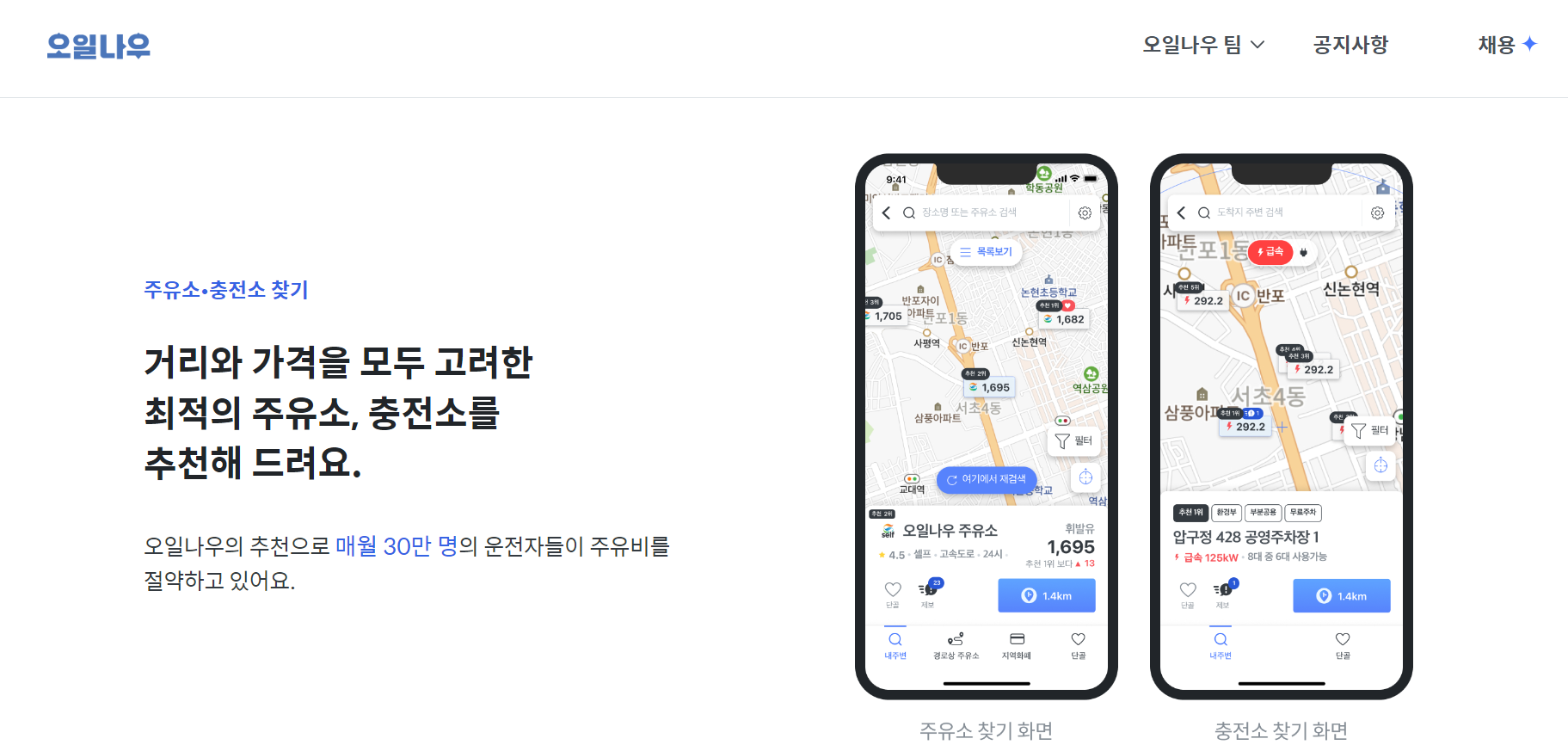 오일나우의 모토는 "운전자의 일상은 편안하게, 주말은 더 자유롭게"라는 모토로 누적 다운로드 150만건, 월간 순 이용자 수 30만 명을 돌파하였습니다. 오일나우는 운전자들이 가장 자주 겪는 주유 고민을 해결하기 위해 출발했으며 세차, 보험, 커머스, 전기차 충전으로 다양한 고민을 해결하고 있습니다. 그리고 현재 구글 플레이 스토어 평점 4.9점의 유일한 모빌리티 입으로 사랑받고 있습니다.