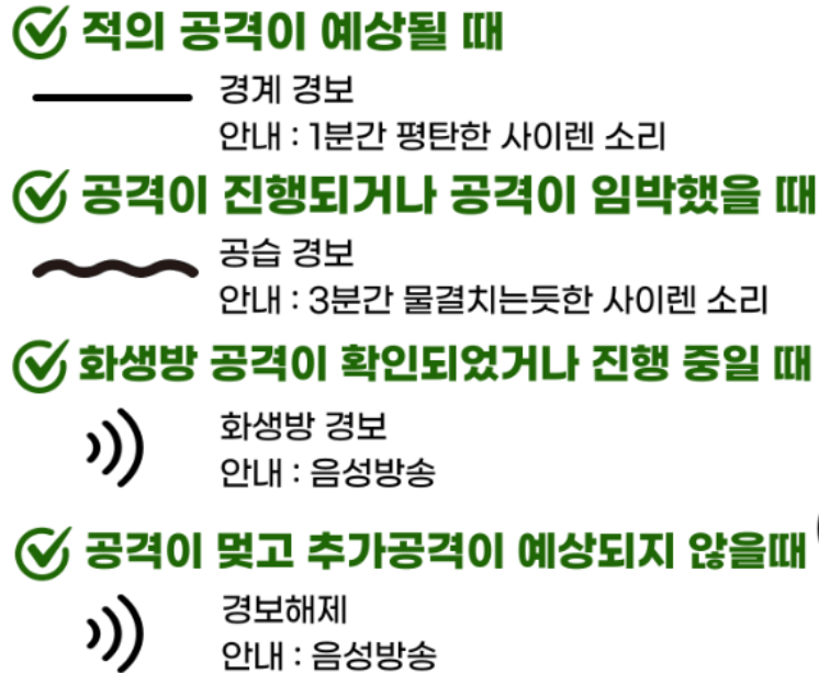 내용 : 경보발령에 따른 주민대피 및 차량 교통 통제 공습경보 (15분) 경계경보 (4분) 경보해제 (1분)