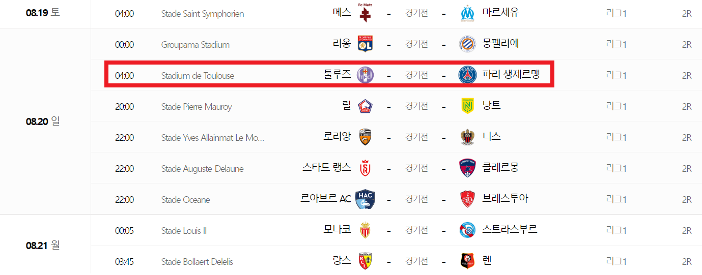 2023년 8월 20일 (일) 새벽 4시 파리 생제르맹 vs 툴루즈