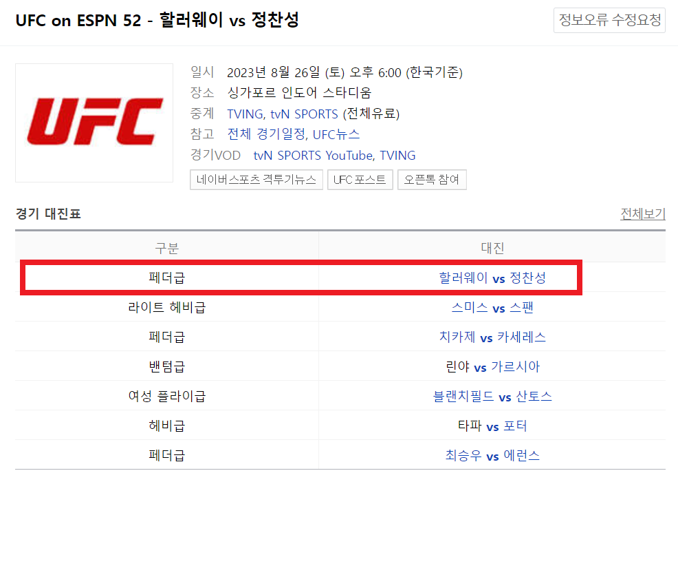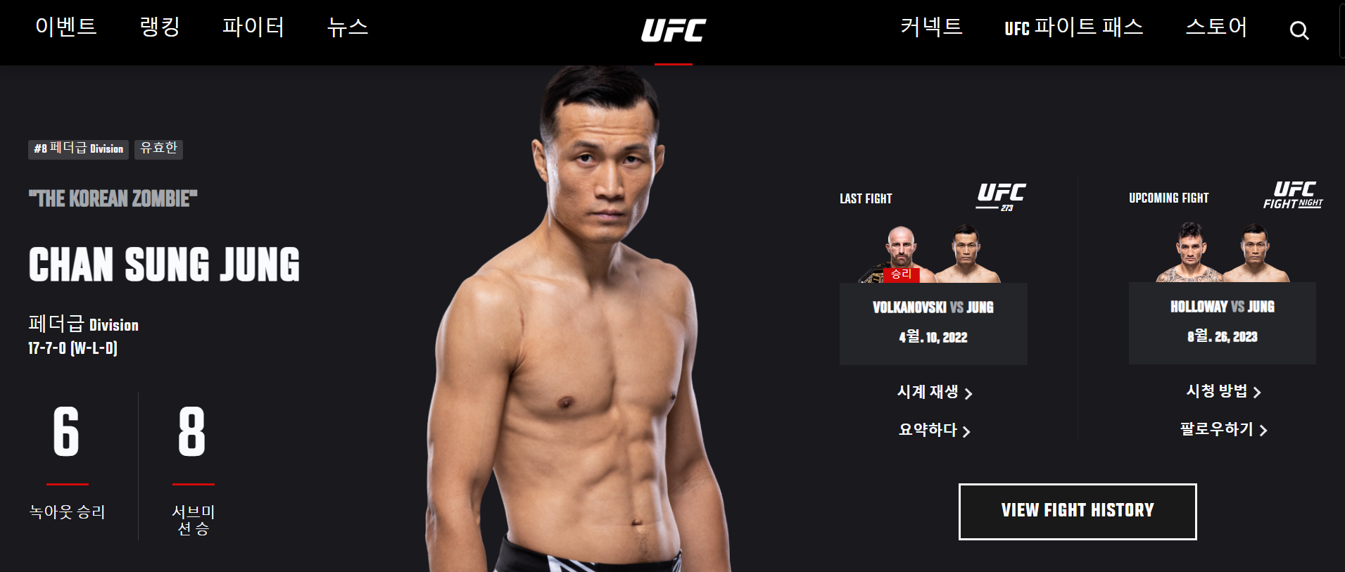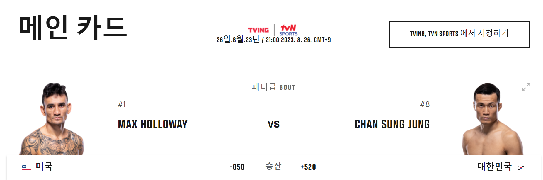 한국의 '코리안 좀비' 정찬성이 1년 4개월 만에 옥타곤 복귀전을 치릅니다. 정찬성의 페더급 랭킹은 8위이지만 상대는 현 페더급 랭킹 1위 맥스 할로웨이입니다. 이 두 사람의 경기를 기다리는 많은 팬들이 있습니다. 둘의 경기를 보여주는 중계는 티빙 또는 TVNsports에서 볼 수 있습니다. 정찬성의 경기 일정은 8월 26일 (토) 오후 9시에 열립니다.